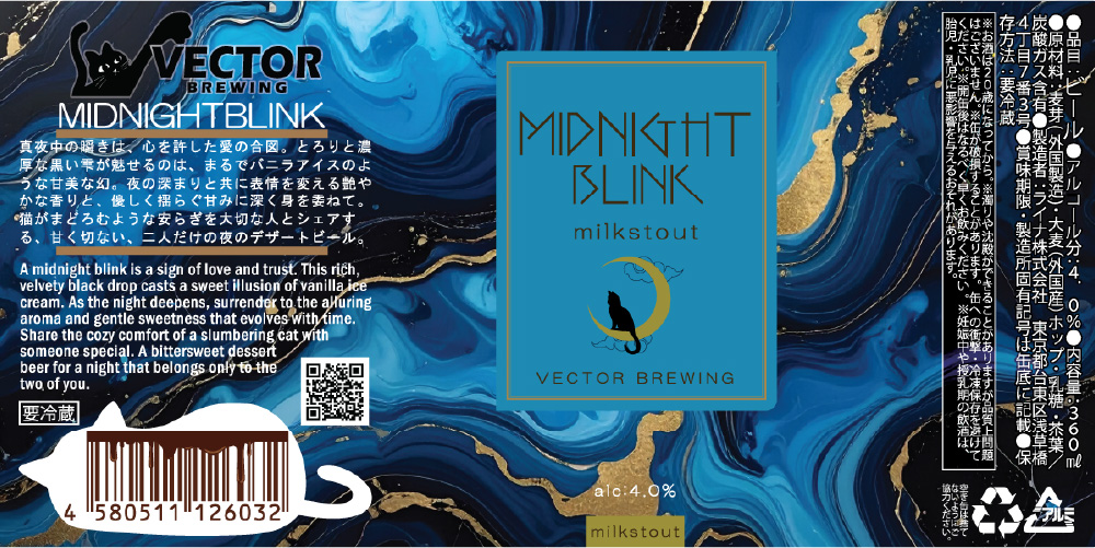 とろりと濃密な黒いMilkStout。アルコール感は優しく、まるでバニラアイスのような甘い味わい。モルトを贅沢に使いリッチな飲み口で、温度変化と共に表情を変え香りを楽しめます。ネーミングの由来は、夜中に優しく揺らぐ甘みに深く身を委ねて、猫がまどろむような安らぎを大切な人とシェアする、甘く切ない、二人だけの夜のデザートビールをイメージしています。BLINK(ブリンク)は猫がゆっくり瞬きをする仕草(Cat Kiss=信頼と愛の証)を意味します。