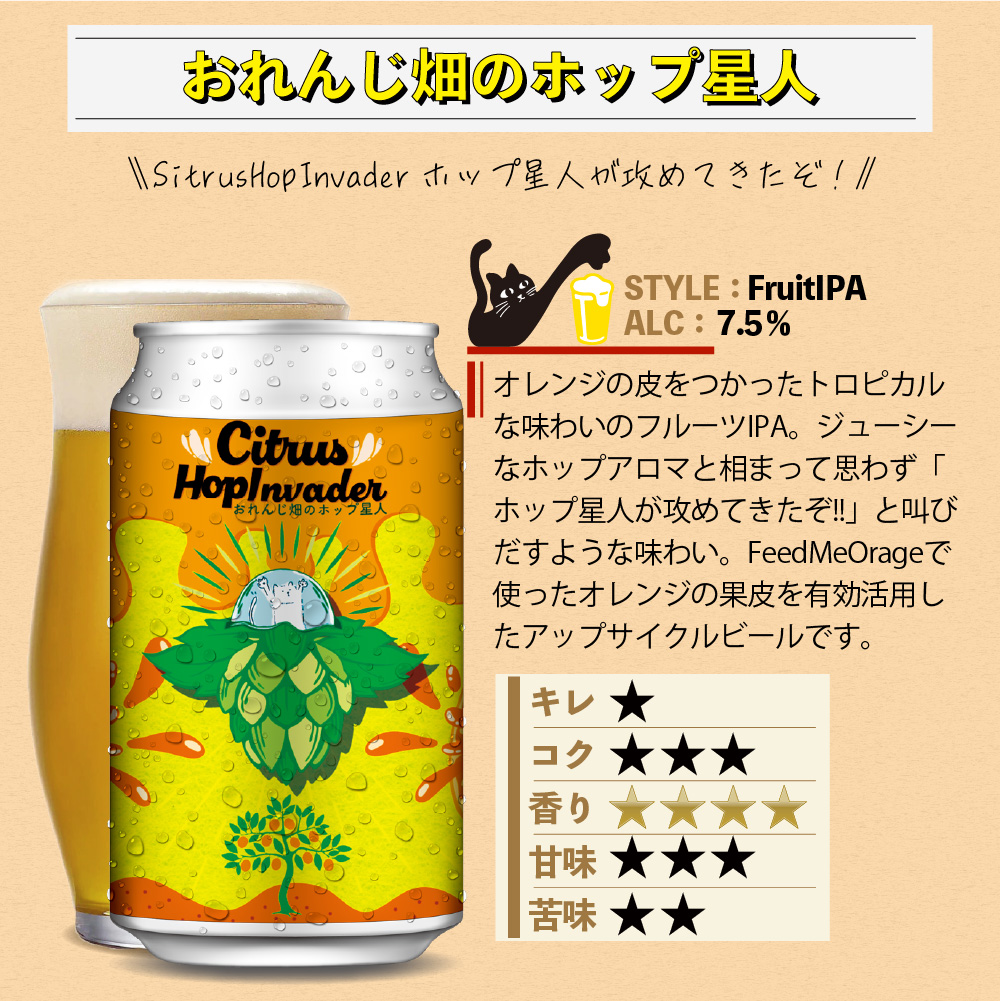 オレンジの皮つかったトロピカルな味わいのフルーツIPA。ジューシーなホップアロマと相まって思わず「ホップ星人が攻めてきたぞ!!」と叫びだすような味わい。