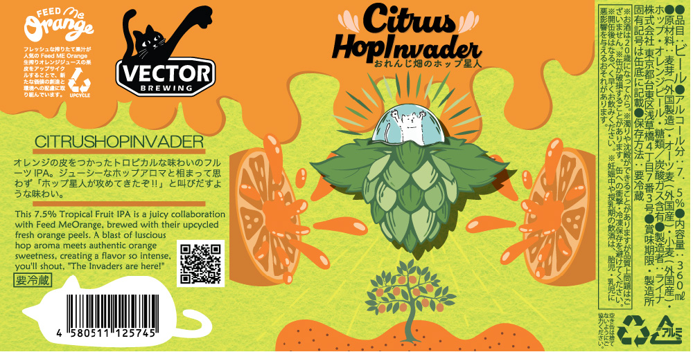 FeedMeOrangeで使った、通常は廃棄されるオレンジの残渣を、ビール醸造用の副原料として有効活用したアップサイクルビール。贅沢に麦芽をつかいしっかりとした飲み口に爽やかに香る柑橘香が特徴的。ホップ由来のジューシーでトロピカルな香りも相まって、ビール版ミックスジュースのような仕上がり。アルコールは7.5%ですが爽やかな飲み口がハイアルコールを感じさせない味わい。